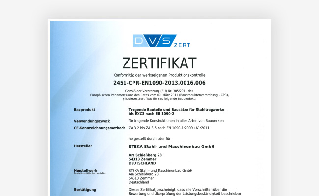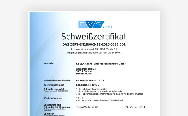 Bescheinigung über die Herstellerqualifikation zum Schweißen von Stahlbauten