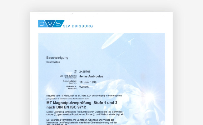 Bescheinigung MT Magnetpulverprüfung Stufe 1 und 2 nach DIN EN ISO 9712